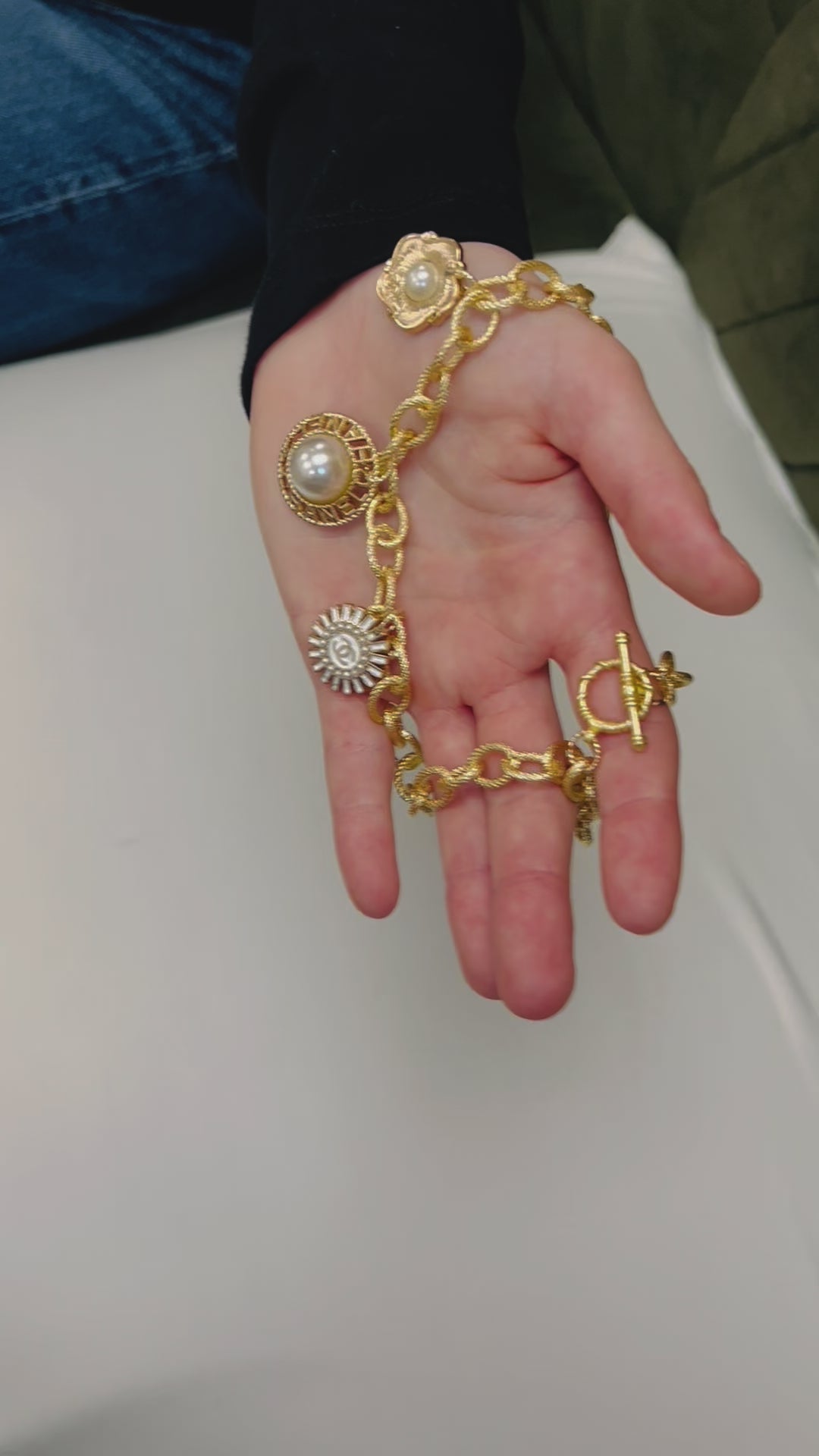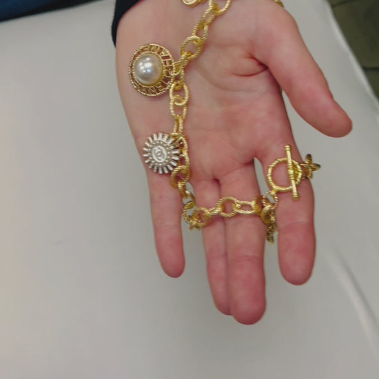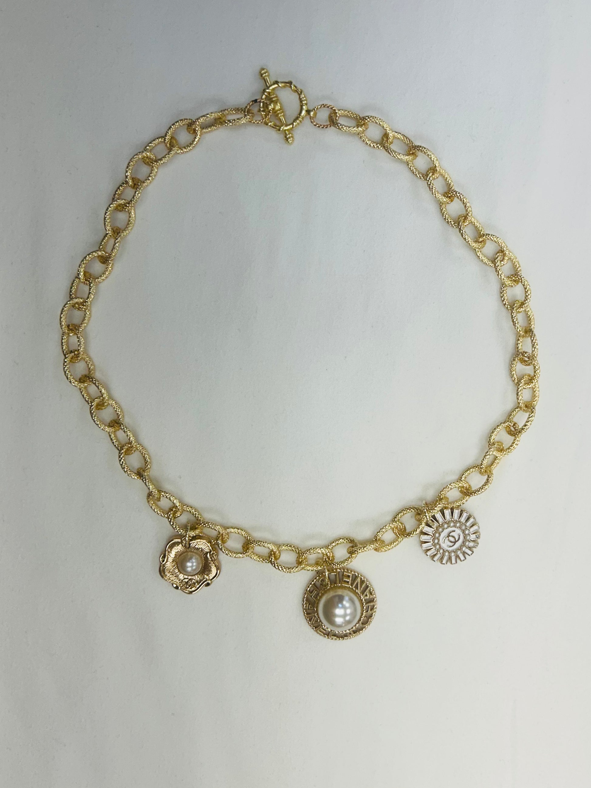 Authentic Chanel vintage + repurposed gold, faux pearl and white enamel 3 charm (sized 23, 19 + 19 mm) necklace. Twisted matte gold filled 18" oval link (8x11mm) necklace. Chanel charms are stamped.