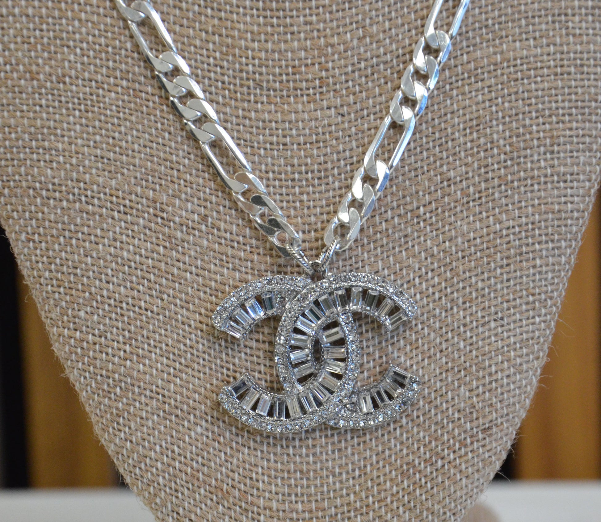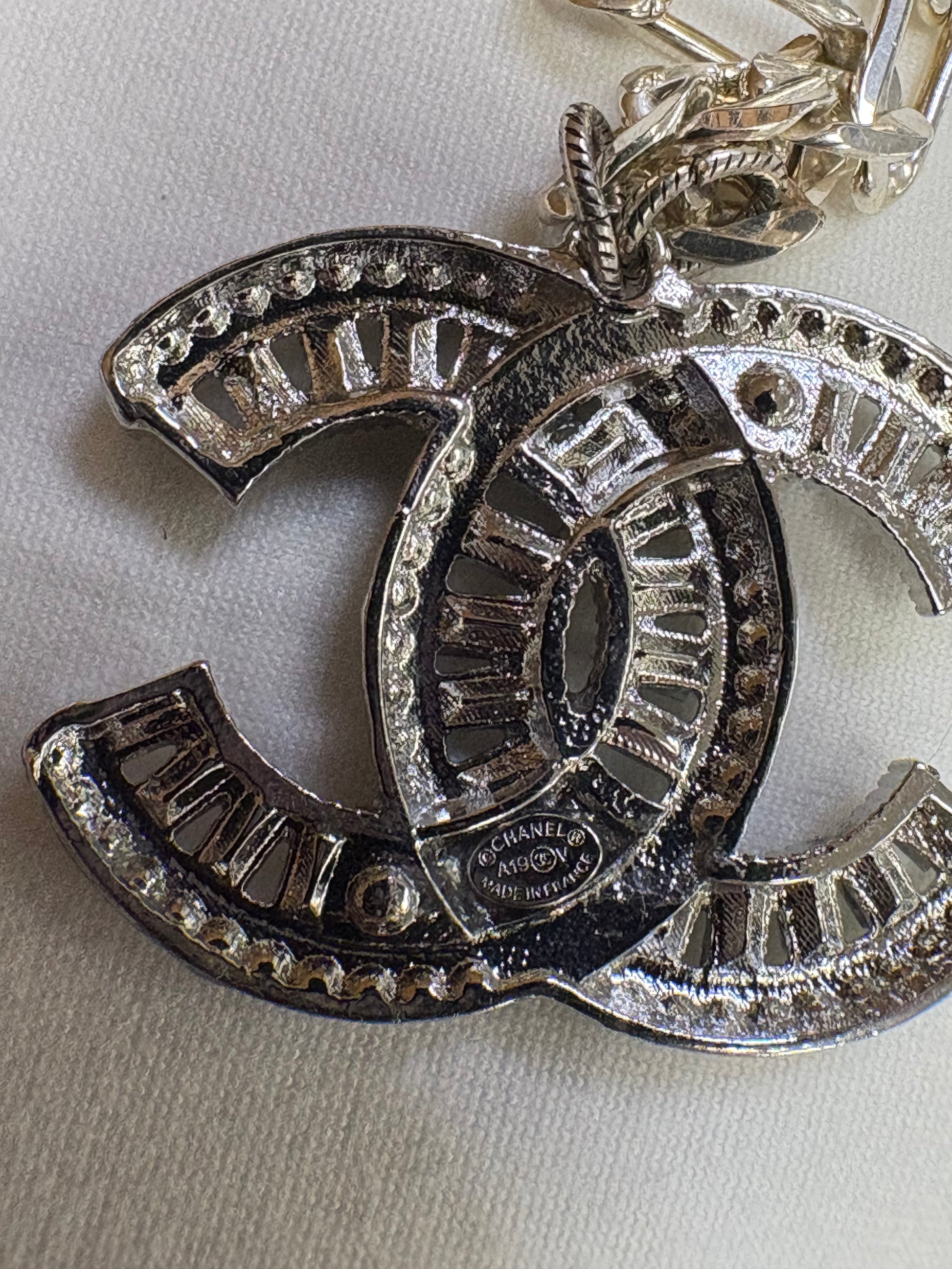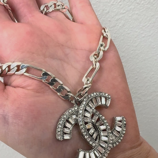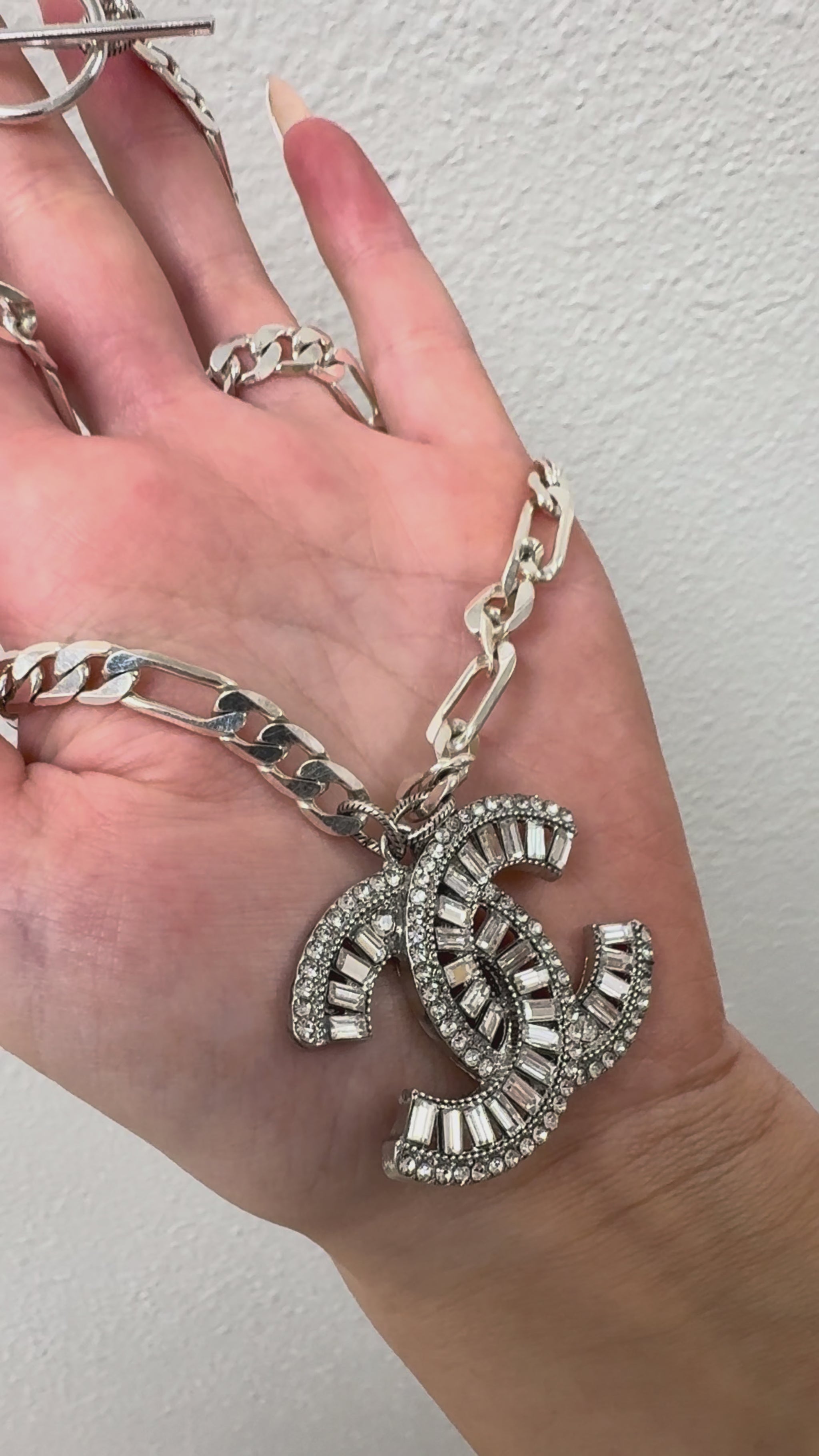 Authentic vintage + repurposed Chanel large crystal silver brooch (38x30mm ) on a sterling silver 18” chain. Brooch is stamped.