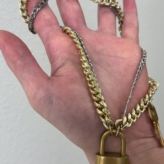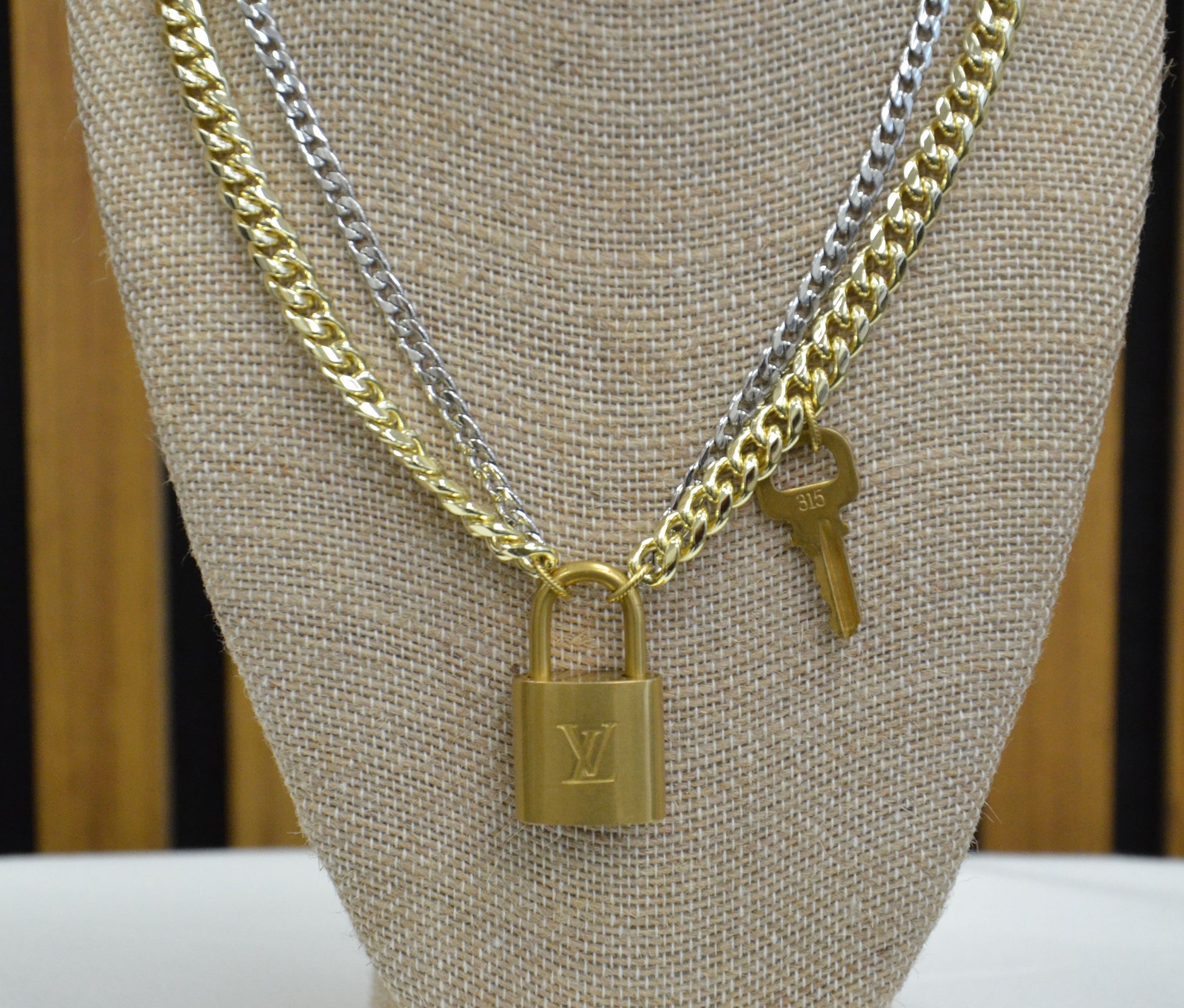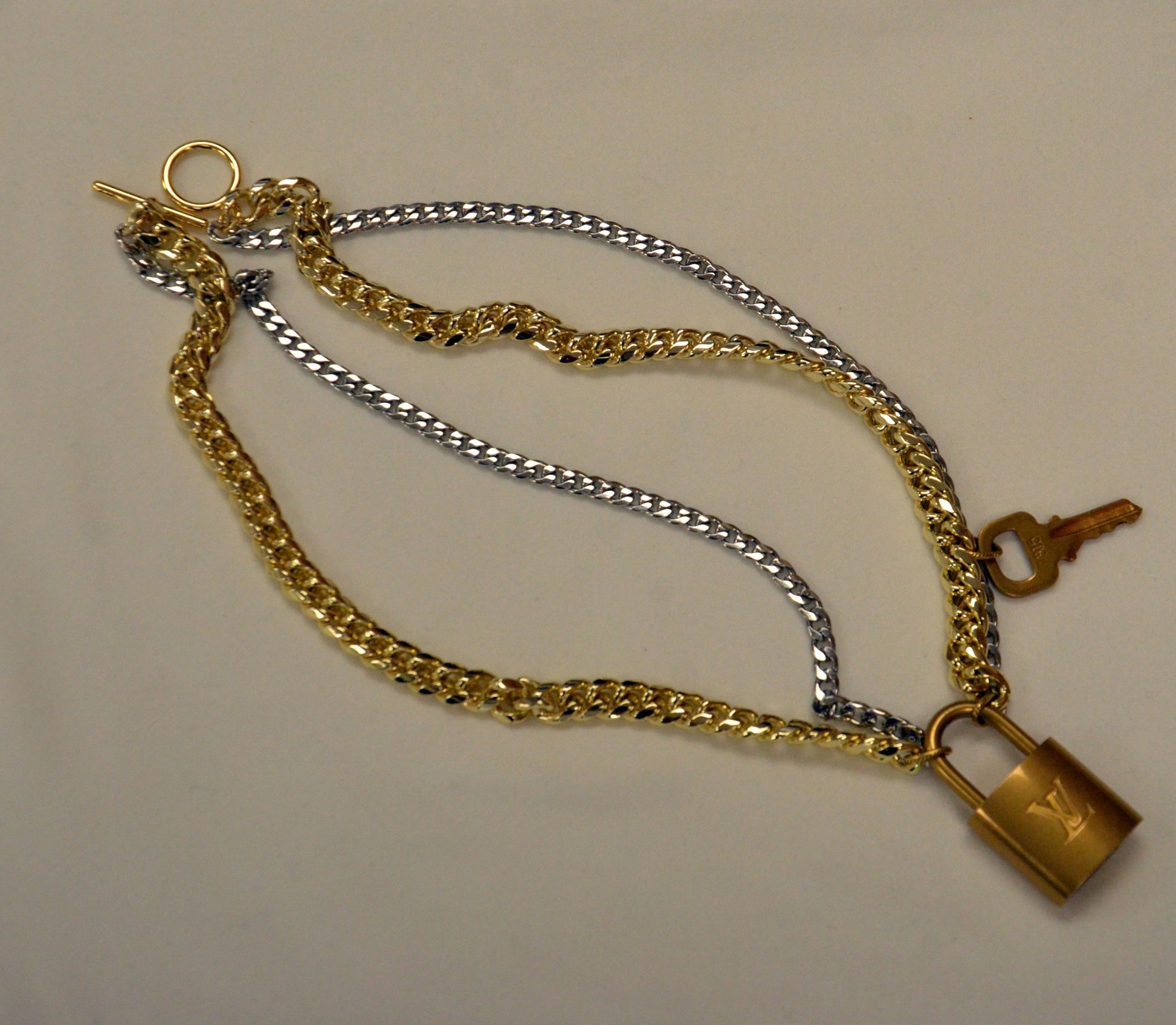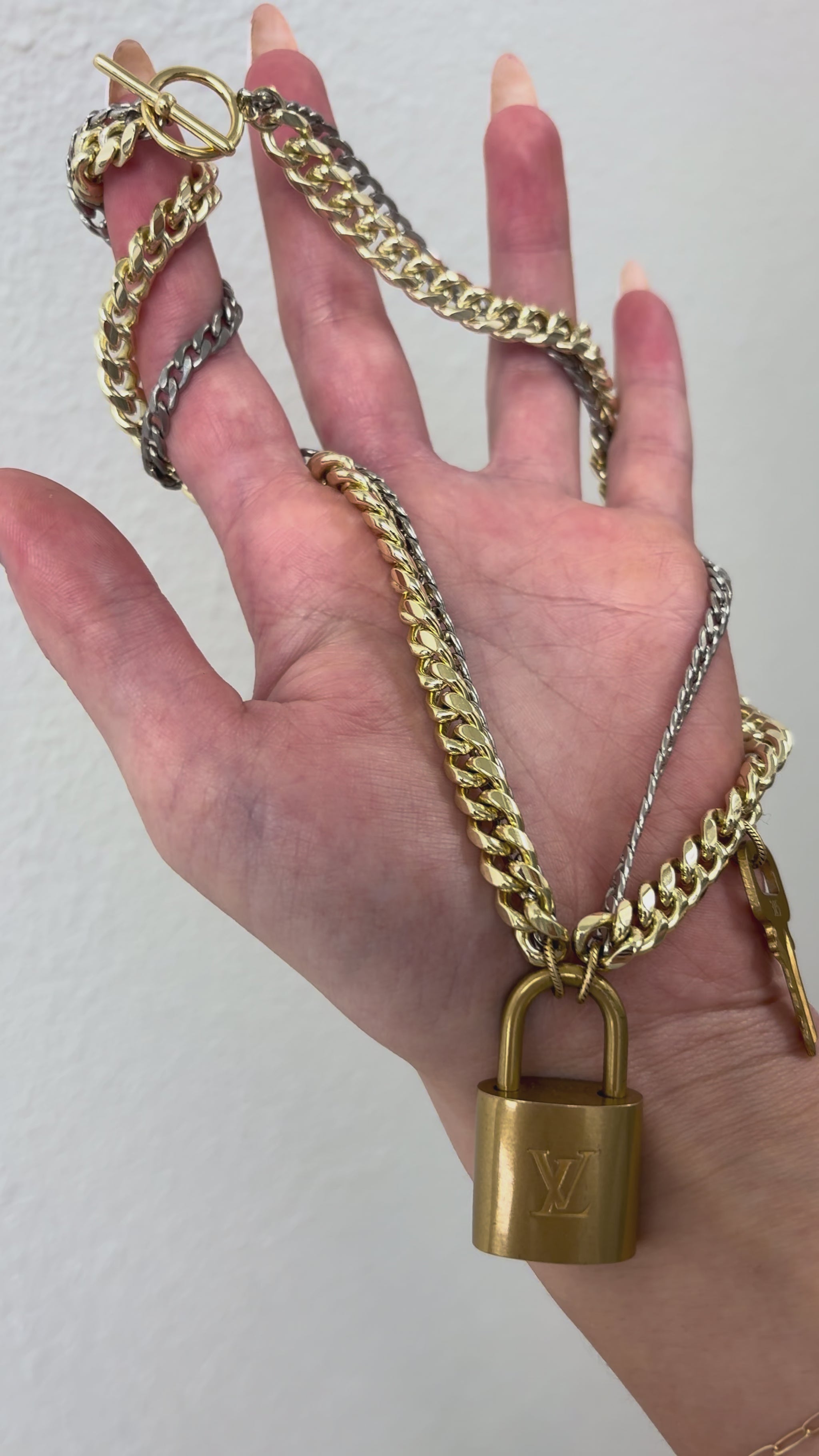 Authentic Louis Vuitton vintage + repurposed lock and key on multi-tone, double strand necklace (1st strand = 16” 2nd strand = 18”). 18k gold-filled and sterling silver curb chain with a gold-filled clasp. LV lock and key are both stamped.