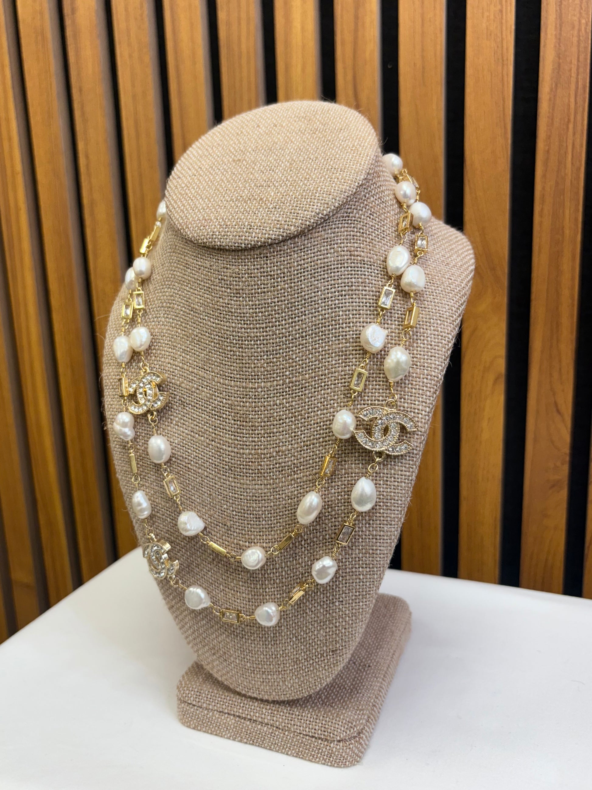 Authentic Chanel vintage + repurposed charms (3 crystal and gold) on a a long 39" fresh water pearl, crystal and gold filled necklace with a large gold filled lobster clasp. Charms are stamped. Can be worn single or double strand.